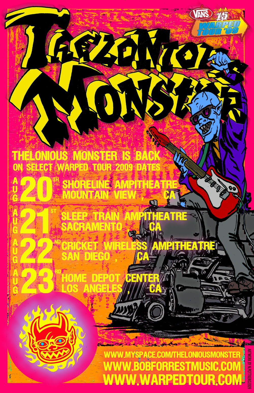 A couple months ago Bob Forrest (vocalist and drug counselor, now on VH1’s Celebrity Rehab) received a phone call offering Thelonious Monster a stint on the Punk Legends stage for the 15th anniversary of the Warped Tour. In the LA scene these guys were legends. The band that could of been huge but got caught up in addiction, watching their friends soar around them. They arguably wrote better songs, but it simply wasn’t meant to be. The last time Thelonious Monster played a show was during a residency in December of 2004. They put out an album that year (After a 9 year gap) and played Coachella but that was pretty much that.